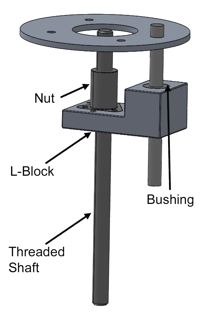 Because the nut must be free to move up and down the rotating screw, it might also rotate along with the screw, interrupting smooth operation. To prevent this, Thompson helped the team customize an L-shaped block that interfaced with the nut and rode with it along the main axis. The block was also fixed to a bushing guided by a shaft that was anchored to a plate just below the motor. (Figure 2)